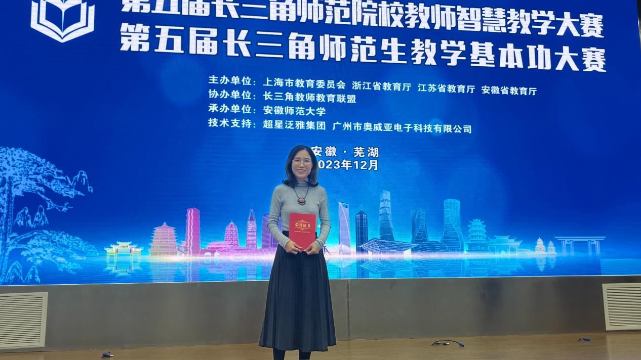 本次大赛由安徽省教育厅、上海市教育委员会、浙江省教育厅、江苏省教育厅联合举办,分人文社科组、理工组、艺术组和体育组四个组别。来自长三角地区51所高校超300多名师生参加了比赛。经过省赛选拔和长三角师范院校现场赛,陈帆帆老师凭借其优秀的教学技能和对智慧教学的良好把握,脱颖而出,赢得了评委们的一致好评。