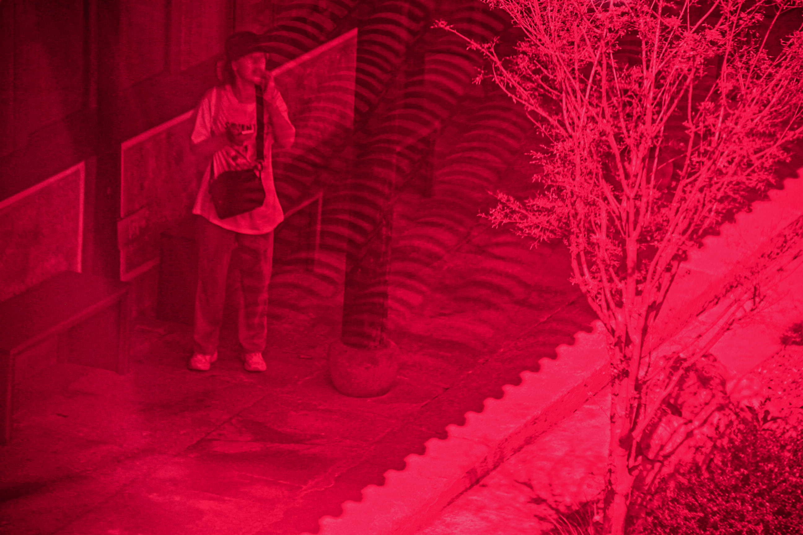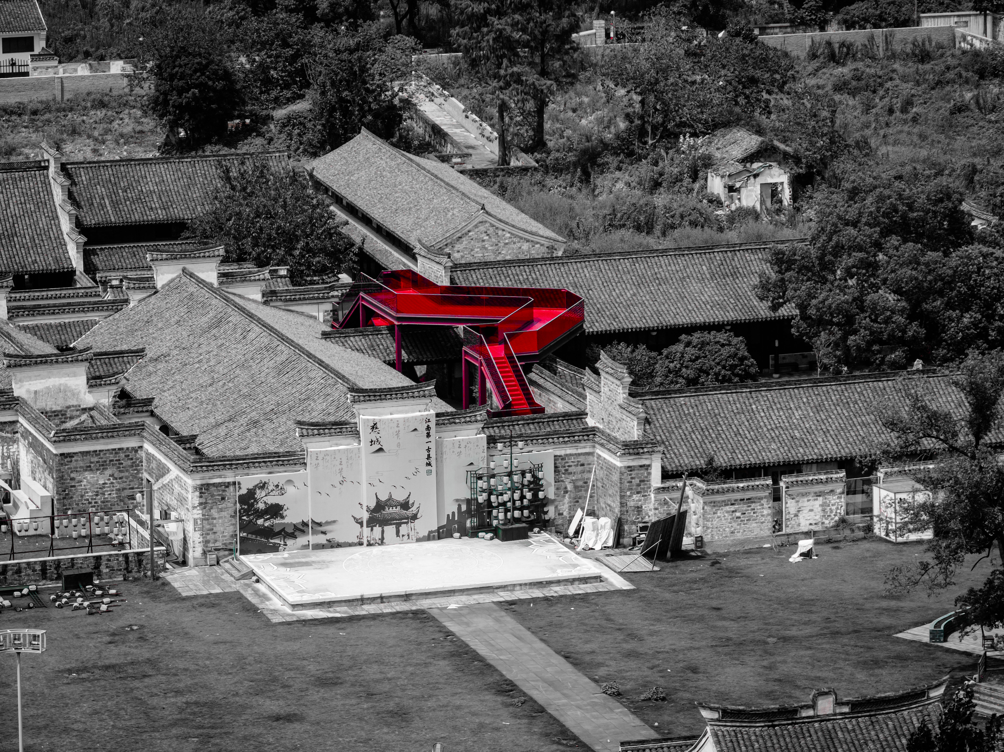 本作品的摄影地点为慈城内的周信芳戏剧艺术馆,信步馆中,一座从屋檐上方“横空出世”的红桥颇为亮眼。据了解,此红桥的设计师为宁波大学潘天寿艺术设计学院教授邵良,其设计理念就是将传统文化与现代艺术交融,从沉浸式、情景式的角度综合考虑全新的建筑功能。这座红桥不管从高度、材质、颜色、线条上都与原建筑风貌形成了一种对比,这即是一种视觉上的对比,亦是一种时代文明的碰撞,走上红桥,对每一个游客来说都是一种享受,看慈城古镇的全景,品古今传承之韵。